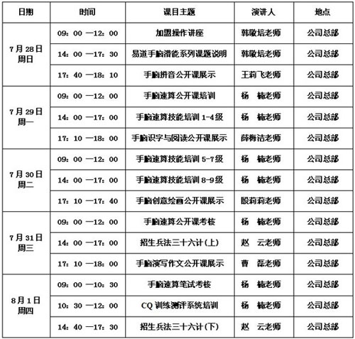本次易道教育手腦速算師資培訓(xùn)安排如下: