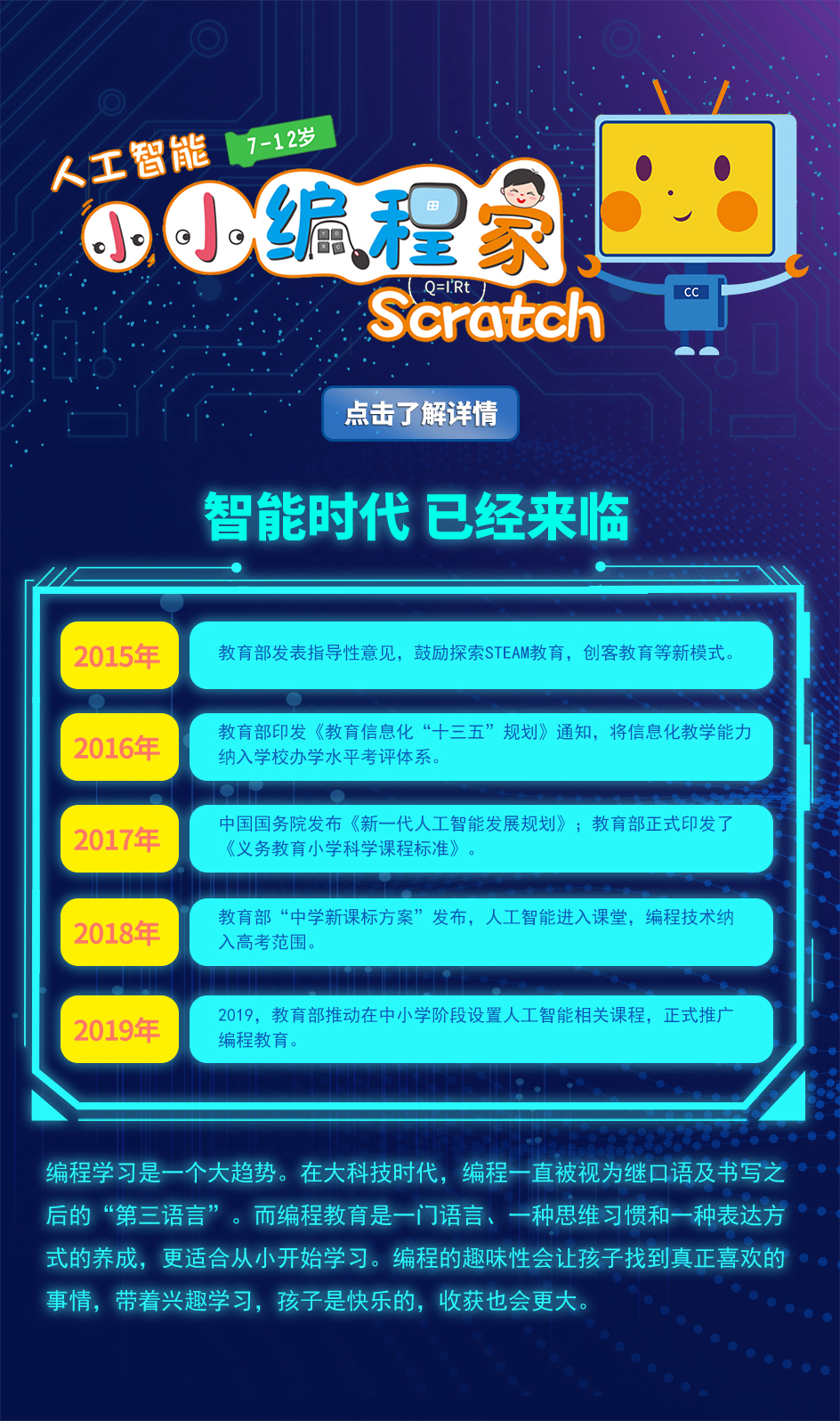 Scratch 是可視化的編程語言,讓孩子從“拖拽”開始學編程,其豐富的學習環境及可操作性適合7—12歲的孩子進行學習。易道教育推出的《人工智能—小小編程家Scratch》系列教程,包其教學內容涉及多學科深度融合,數學、物理、機械、電子、工程、通信、編程、藝術、生活等,理論與實踐相結合,滿足人工智能科創教育實踐和STREAM1創新教育實踐需求,實現寓教于樂、著重素質及多學科相融合。