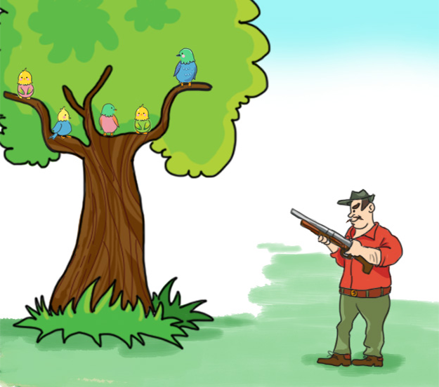 孩子答道:樹上有5只鳥,它們是相親相愛的一家人。有一天,壞獵人叔叔舉起獵槍把爸爸給打死了,媽媽膽小嚇飛了,剩下3只嗷嗷待哺的小鳥飛不動。