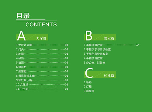 應用系統:教室裝潢、教材外觀、教具外觀、產品包裝、辦公用品、交通工具、服裝服飾、廣告媒體、展架、展板、公開課禮品、陳列展示等。它是CI系統的外表形象。